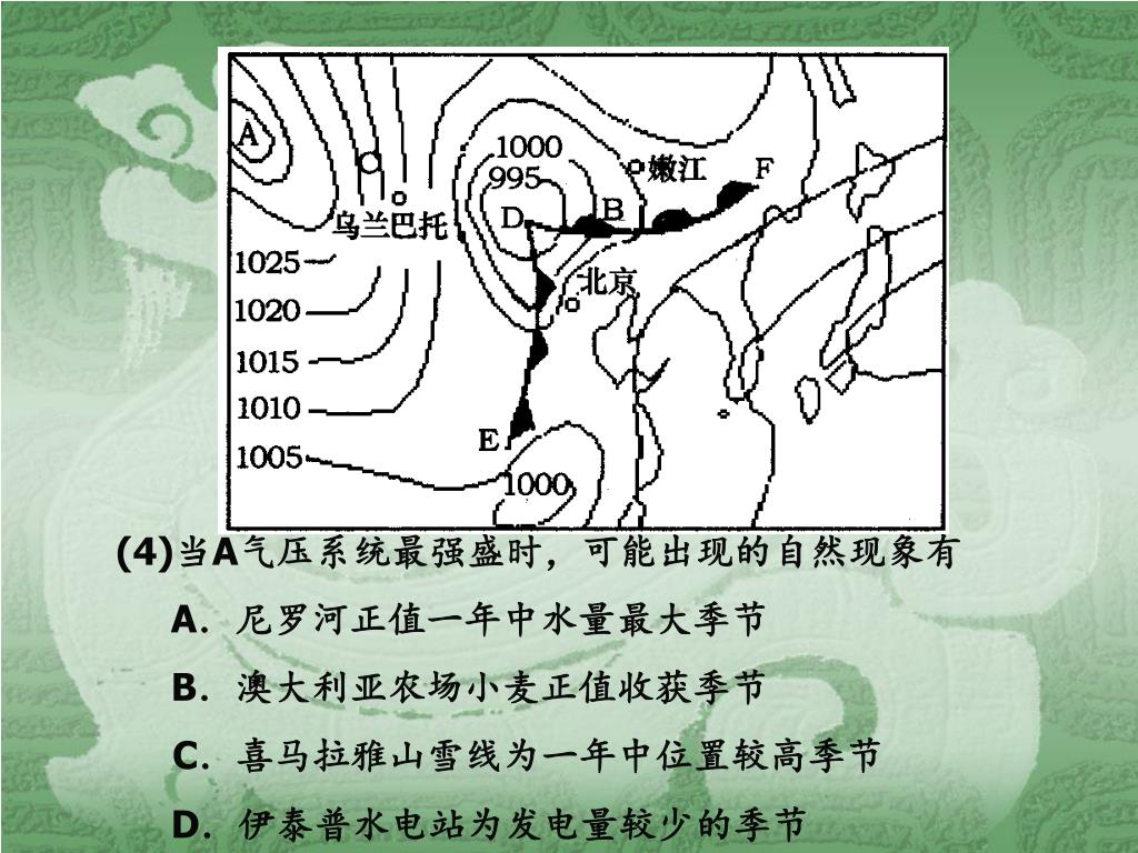 (4)当A气压系统最强盛时,可能出现的自然现象有(4)当A气压系统最强盛时,可能出现的自然现象有 A.尼罗河正值一年中水量最大季节 B.澳大利亚农场小麦正值收获季节 C.喜马拉雅山雪线为一年中位置较高季节 D.伊泰普水电站为发电量较少的季节