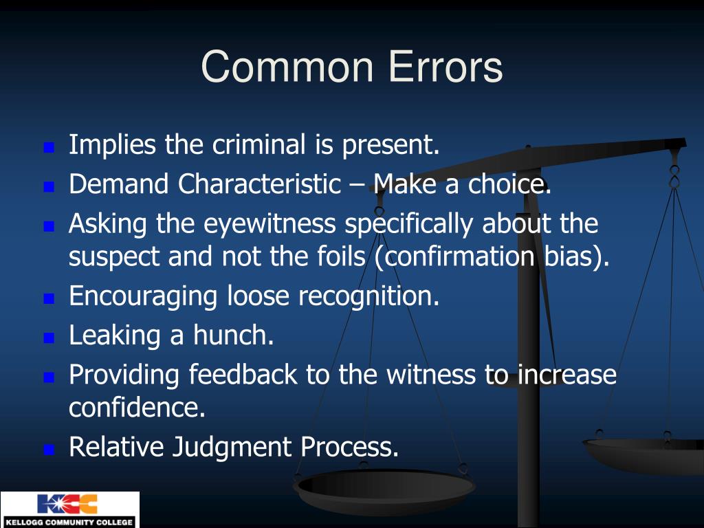 Common Errors • Implies the criminal is present. • Demand Characteristic – Make a choice. • Asking the eyewitness specifically about the suspect and not the foils (confirmation bias). • Encouraging loose recognition. • Leaking a hunch. • Providing feedback to the witness to increase confidence. • Relative Judgment Process.