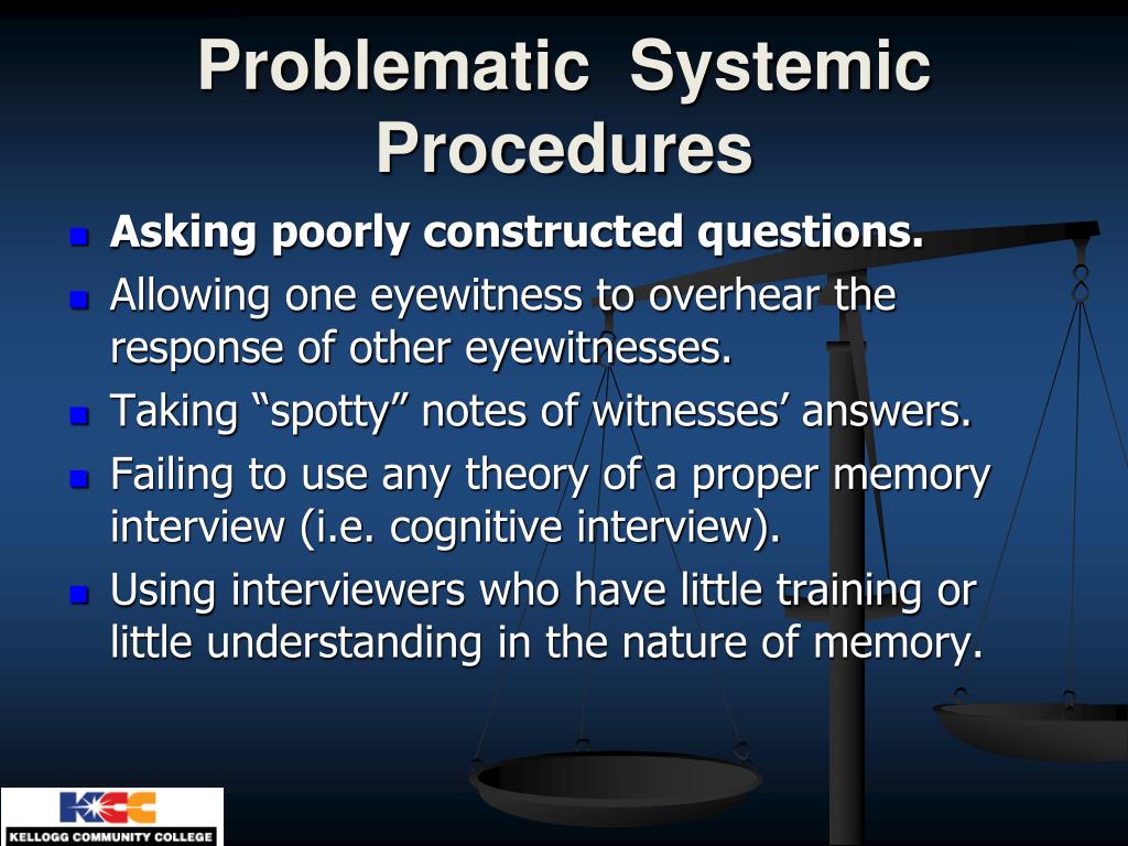 Problematic Systemic Procedures • Asking poorly constructed questions. • Allowing one eyewitness to overhear the response of other eyewitnesses. • Taking “spotty” notes of witnesses’ answers. • Failing to use any theory of a proper memory interview (i.e. cognitive interview). • Using interviewers who have little training or little understanding in the nature of memory.