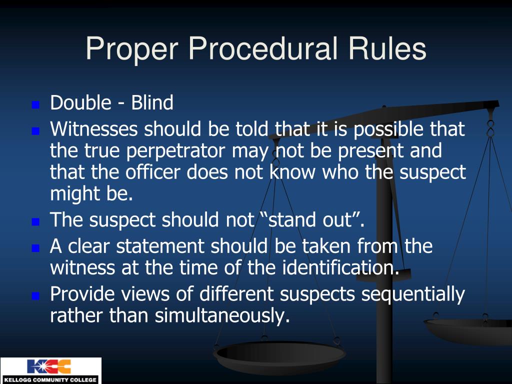 Proper Procedural Rules Double - Blind Witnesses should be told that it is possible that the true perpetrator may not be present and that the officer does not know who the suspect might be. The suspect should not “stand out”. A clear statement should be taken from the witness at the time of the identification. Provide views of different suspects sequentially rather than simultaneously.