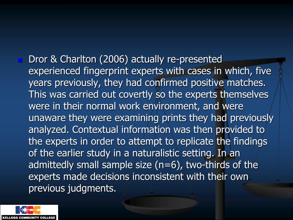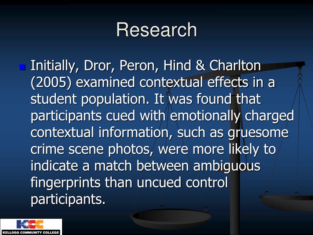 Research • Initially, Dror, Peron, Hind & Charlton (2005) examined contextual effects in a student population. It was found that participants cued with emotionally charged contextual information, such as gruesome crime scene photos, were more likely to indicate a match between ambiguous fingerprints than uncued control participants.