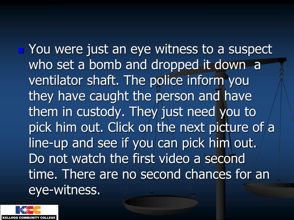 You were just an eye witness to a suspect who set a bomb and dropped it down a ventilator shaft. The police inform you they have caught the person and have them in custody. They just need you to pick him out. Click on the next picture of a line-up and see if you can pick him out. Do not watch the first video a second time. There are no second chances for an eye-witness.
