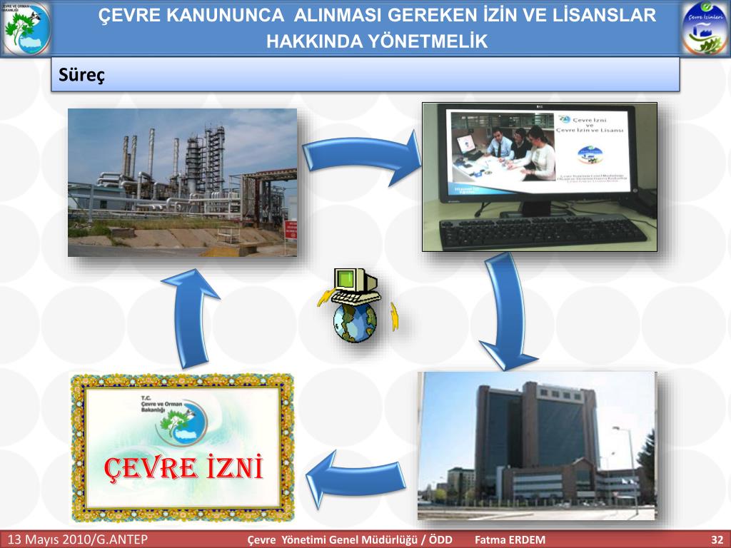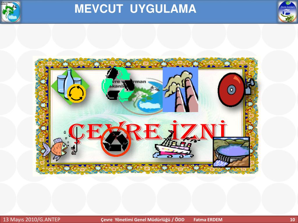 Çevre İzni ve Çevre İzin ve Lisansı. Fatma ERDEM Çevre Mühendisi. Çevre Yönetimi Genel Müdürlüğü Ölçüm ve Denetim Dairesi Başkanlığı Çevre İzin ve Lisansı Birimi. İÇERİK. MEVCUT UYGULAMA. ÇEVRİMİÇİ ÇEVRE İZİNLERİ PROJESİ. ÇEVRE KANUNUNCA ALINMASI GEREKEN İZİN VE LİSANSLAR