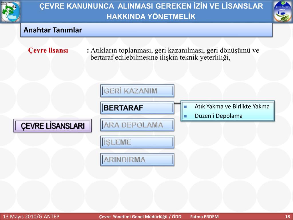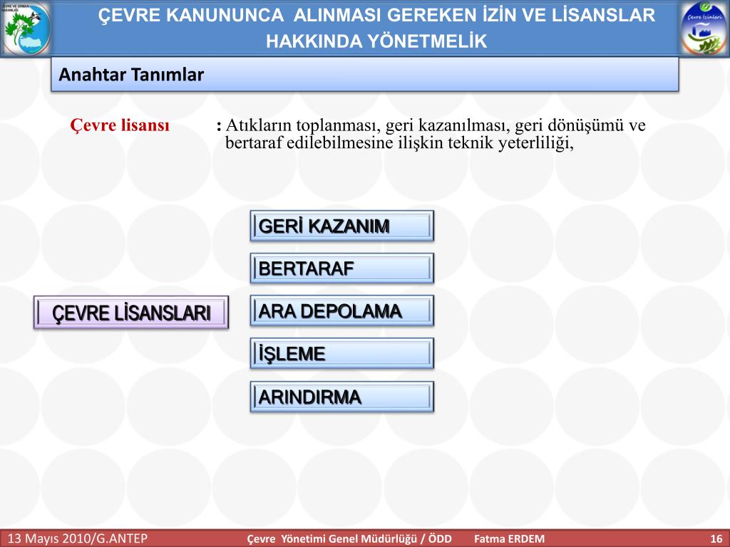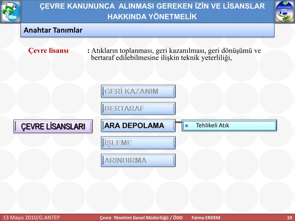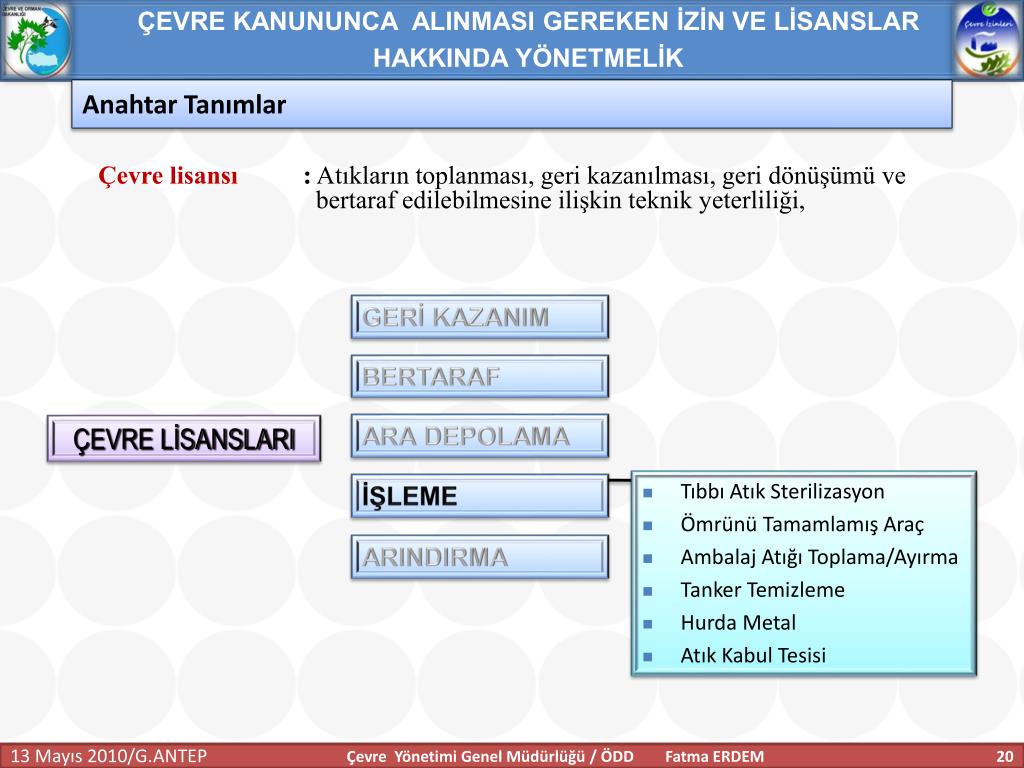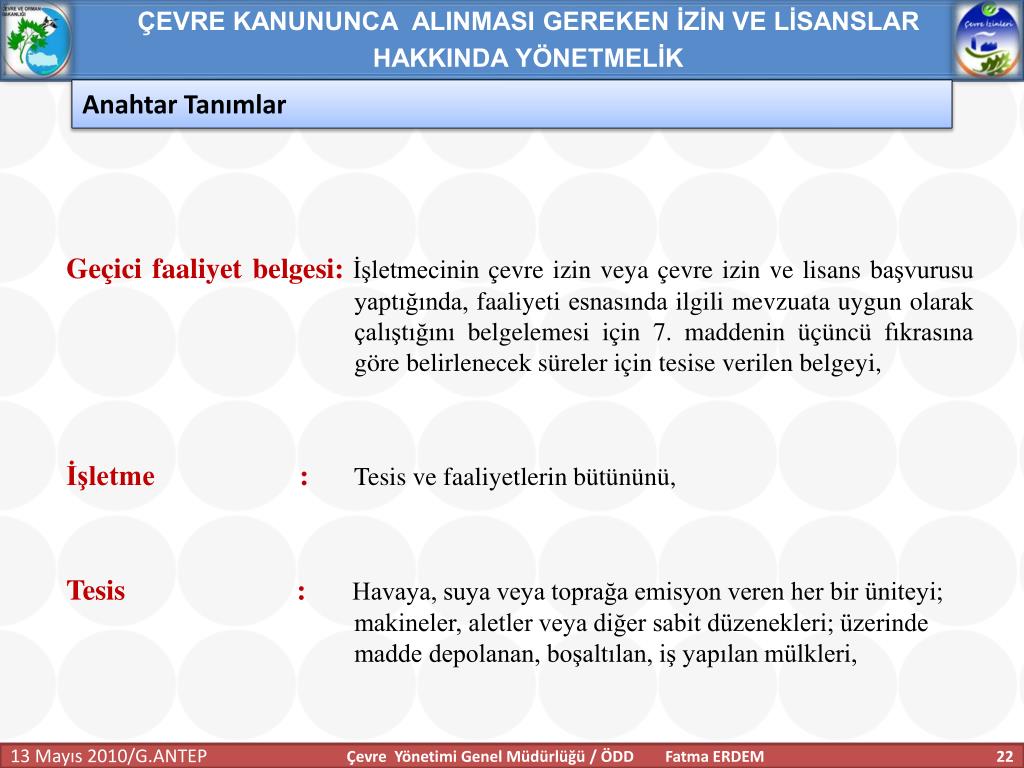 ÇEVRE KANUNUNCA ALINMASI GEREKEN İZİN VE LİSANSLAR HAKKINDA YÖNETMELİK Anahtar Tanımlar Geçici faaliyet belgesi:İşletmecinin çevre izin veya çevre izin ve lisans başvurusu yaptığında, faaliyeti esnasında ilgili mevzuata uygun olarak çalıştığını belgelemesi için 7. maddenin üçüncü fıkrasına göre belirlenecek süreler için tesise verilen belgeyi, İşletme : Tesis ve faaliyetlerin bütününü, Tesis:Havaya, suya veya toprağa emisyon veren her bir üniteyi; makineler, aletler veya diğer sabit düzenekleri; üzerinde madde depolanan, boşaltılan, iş yapılan mülkleri, Çevre Yönetimi Genel Müdürlüğü / ÖDD Fatma ERDEM