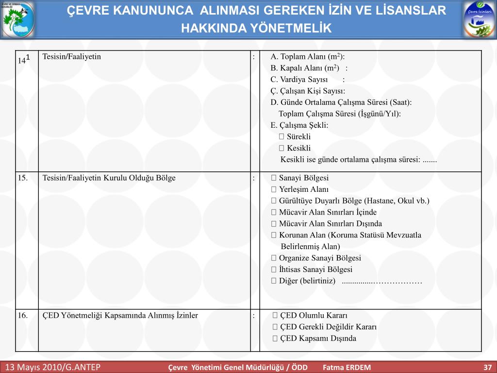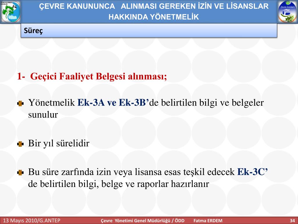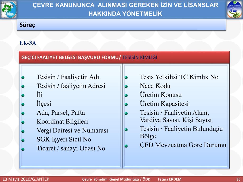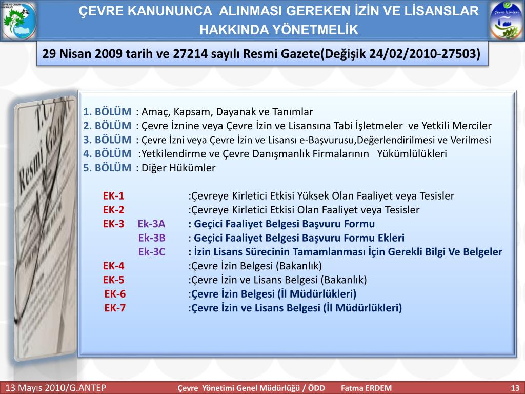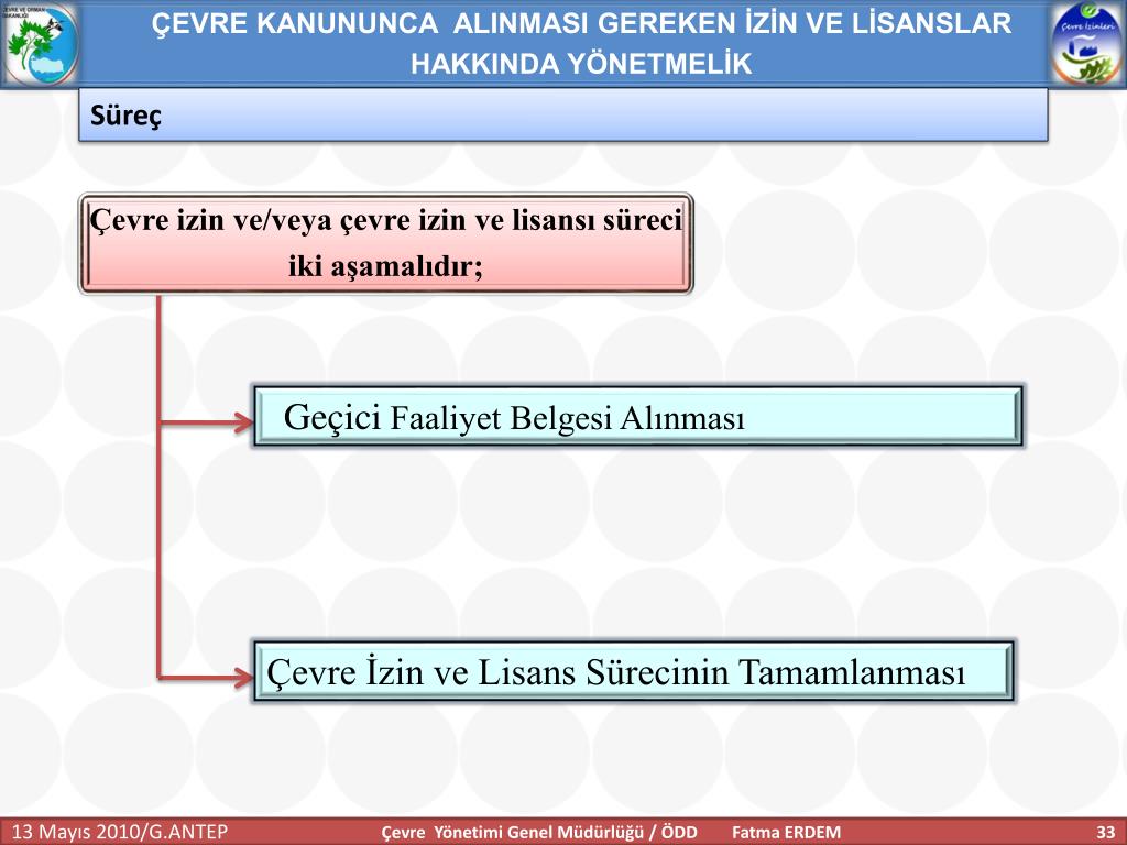 ÇEVRE KANUNUNCA ALINMASI GEREKEN İZİN VE LİSANSLAR HAKKINDA YÖNETMELİK Anahtar Tanımlar Geçici faaliyet belgesi:İşletmecinin çevre izin veya çevre izin ve lisans başvurusu yaptığında, faaliyeti esnasında ilgili mevzuata uygun olarak çalıştığını belgelemesi için 7. maddenin üçüncü fıkrasına göre belirlenecek süreler için tesise verilen belgeyi, İşletme : Tesis ve faaliyetlerin bütününü, Tesis:Havaya, suya veya toprağa emisyon veren her bir üniteyi; makineler, aletler veya diğer sabit düzenekleri; üzerinde madde depolanan, boşaltılan, iş yapılan mülkleri, Çevre Yönetimi Genel Müdürlüğü / ÖDD Fatma ERDEM