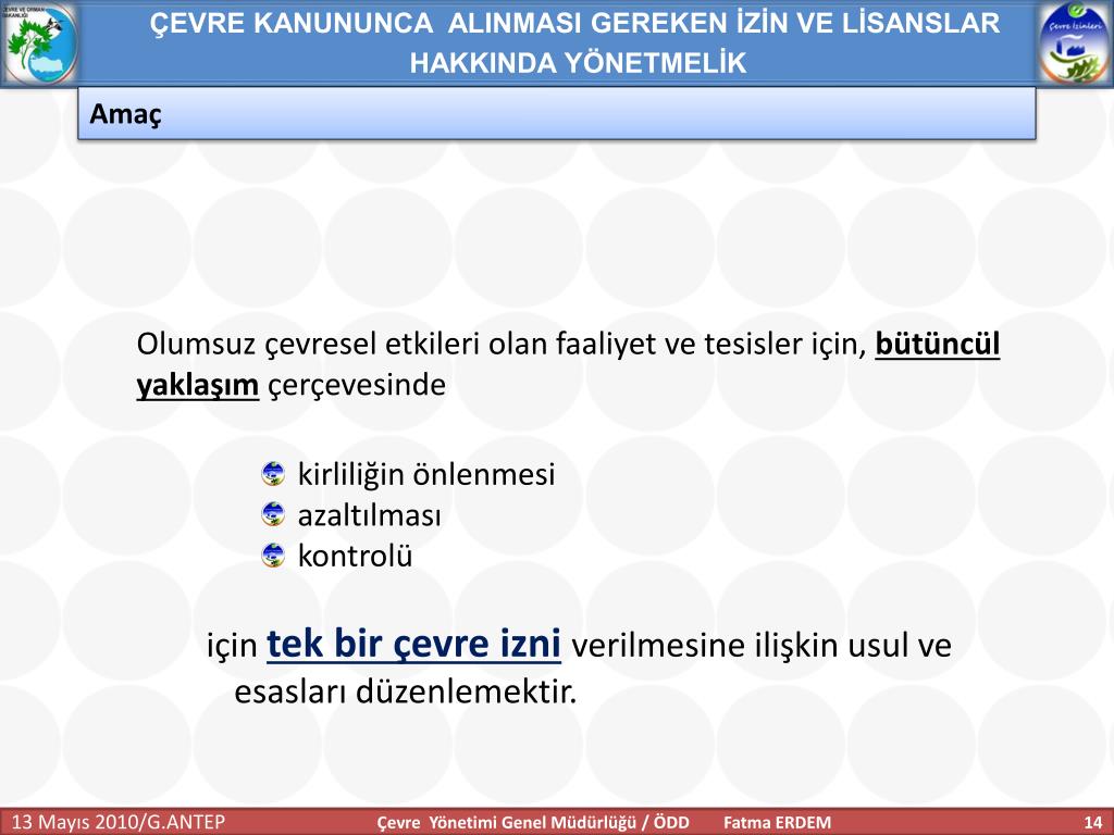 ÇEVRE KANUNUNCA ALINMASI GEREKEN İZİN VE LİSANSLAR HAKKINDA YÖNETMELİK Amaç Olumsuz çevresel etkileri olan faaliyet ve tesisler için, bütüncül yaklaşım çerçevesinde • kirliliğin önlenmesi • azaltılması • kontrolü için tek bir çevre izniverilmesine ilişkin usul ve esasları düzenlemektir. Çevre Yönetimi Genel Müdürlüğü / ÖDD Fatma ERDEM