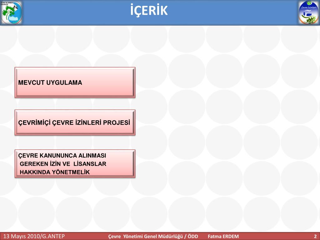 İÇERİK MEVCUT UYGULAMA ÇEVRİMİÇİ ÇEVRE İZİNLERİ PROJESİ ÇEVRE KANUNUNCA ALINMASI GEREKEN İZİN VE LİSANSLAR HAKKINDA YÖNETMELİK Çevre Yönetimi Genel Müdürlüğü / ÖDD Fatma ERDEM