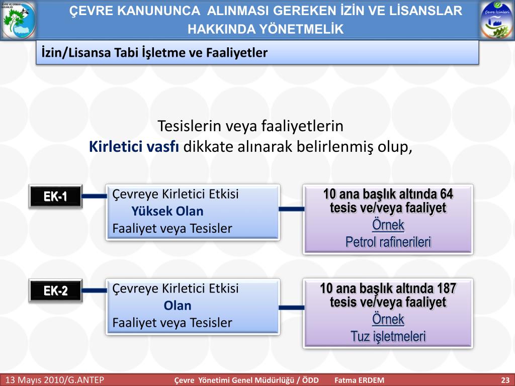 ÇEVRE KANUNUNCA ALINMASI GEREKEN İZİN VE LİSANSLAR HAKKINDA YÖNETMELİK İzin/Lisansa Tabi İşletme ve Faaliyetler Tesislerin veya faaliyetlerin Kirletici vasfı dikkate alınarak belirlenmiş olup, EK-1 Çevreye Kirletici Etkisi Yüksek Olan Faaliyet veya Tesisler 10 ana başlık altında 64 tesis ve/veya faaliyet Örnek Petrol rafinerileri EK-2 Çevreye Kirletici Etkisi Olan Faaliyet veya Tesisler 10 ana başlık altında 187 tesis ve/veya faaliyet Örnek Tuz işletmeleri Çevre Yönetimi Genel Müdürlüğü / ÖDD Fatma ERDEM