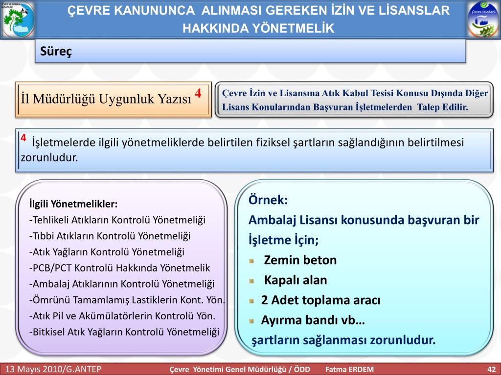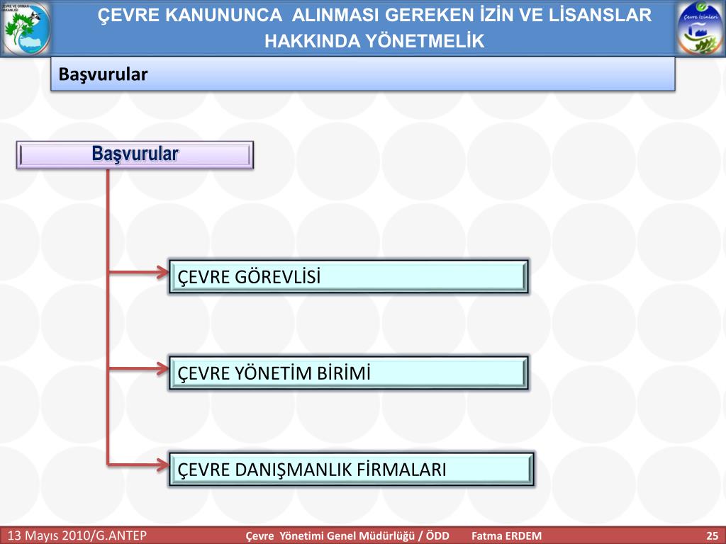 ÇEVRE KANUNUNCA ALINMASI GEREKEN İZİN VE LİSANSLAR HAKKINDA YÖNETMELİK Başvurular Başvurular ÇEVRE GÖREVLİSİ ÇEVRE YÖNETİM BİRİMİ ÇEVRE DANIŞMANLIK FİRMALARI Çevre Yönetimi Genel Müdürlüğü / ÖDD Fatma ERDEM