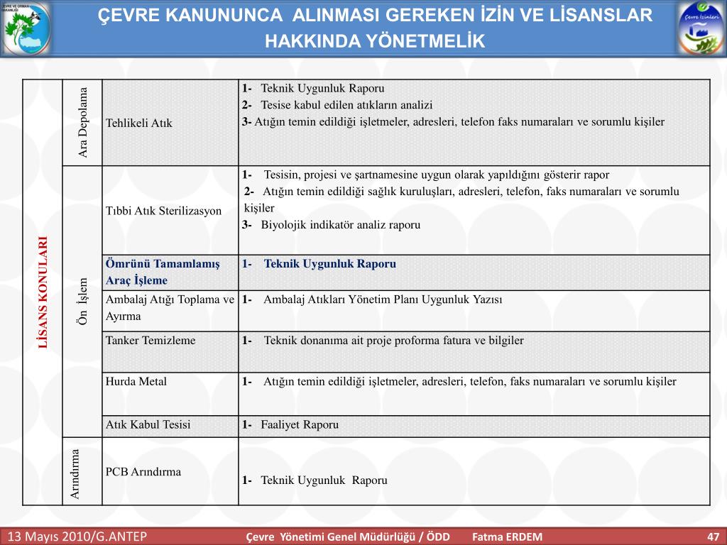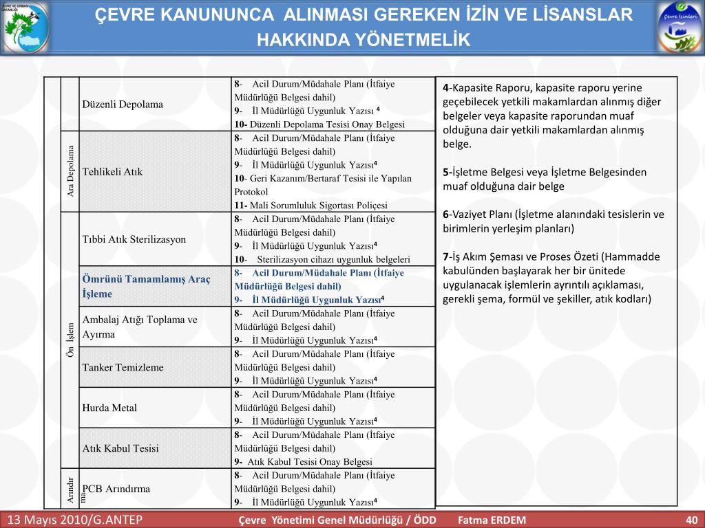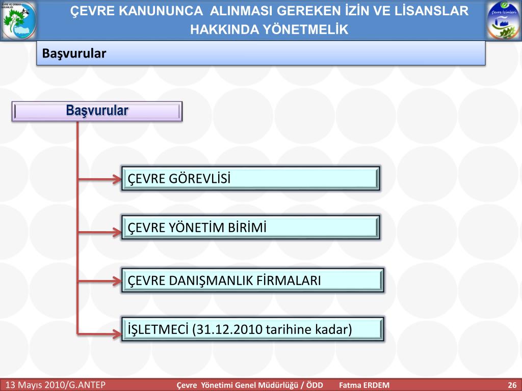 ÇEVRE KANUNUNCA ALINMASI GEREKEN İZİN VE LİSANSLAR HAKKINDA YÖNETMELİK Başvurular Başvurular ÇEVRE GÖREVLİSİ ÇEVRE YÖNETİM BİRİMİ ÇEVRE DANIŞMANLIK FİRMALARI İŞLETMECİ (31.12.2010 tarihine kadar) Çevre Yönetimi Genel Müdürlüğü / ÖDD Fatma ERDEM