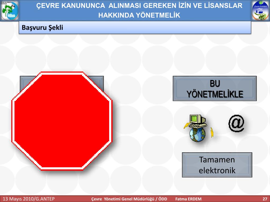 ÇEVRE KANUNUNCA ALINMASI GEREKEN İZİN VE LİSANSLAR HAKKINDA YÖNETMELİK Başvuru Şekli MEVCUT UYGULAMADA BU YÖNETMELİKLE Tamamen elektronik Çevre Yönetimi Genel Müdürlüğü / ÖDD Fatma ERDEM