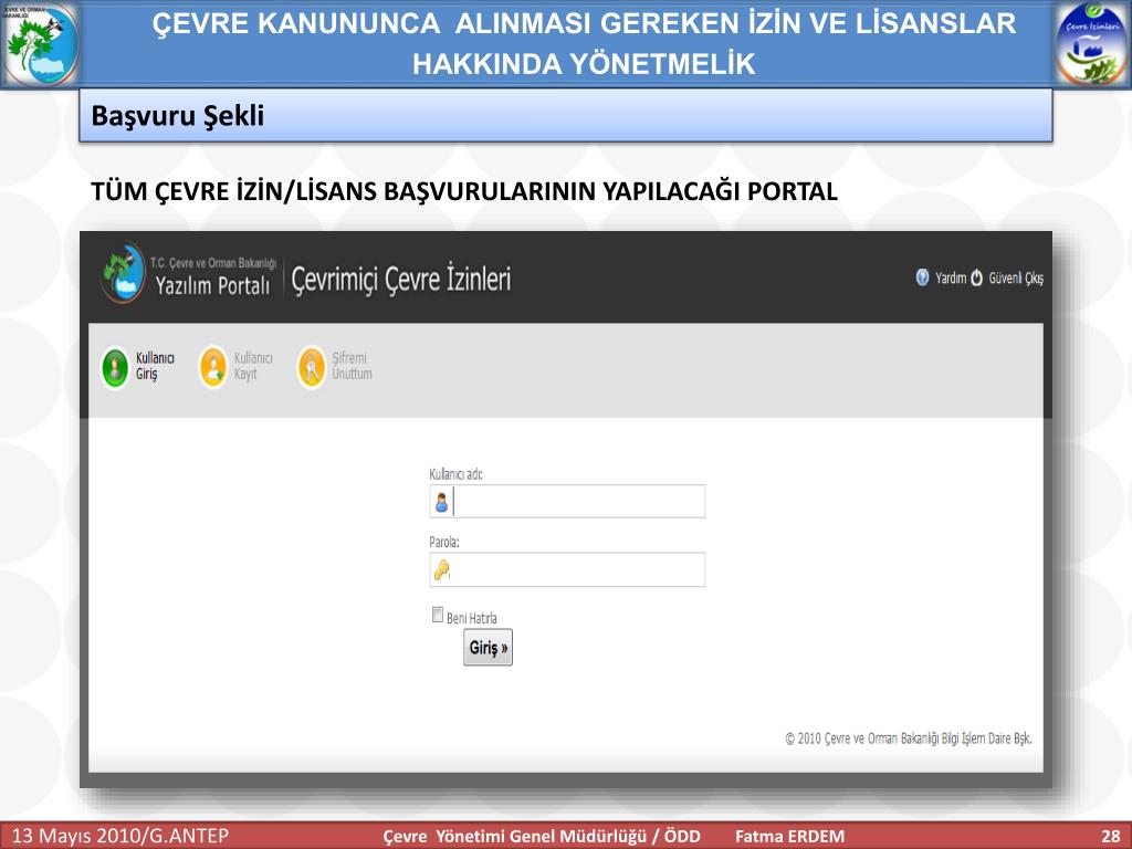 ÇEVRE KANUNUNCA ALINMASI GEREKEN İZİN VE LİSANSLAR HAKKINDA YÖNETMELİK Başvuru Şekli TÜM ÇEVRE İZİN/LİSANS BAŞVURULARININ YAPILACAĞI PORTAL Çevre Yönetimi Genel Müdürlüğü / ÖDD Fatma ERDEM