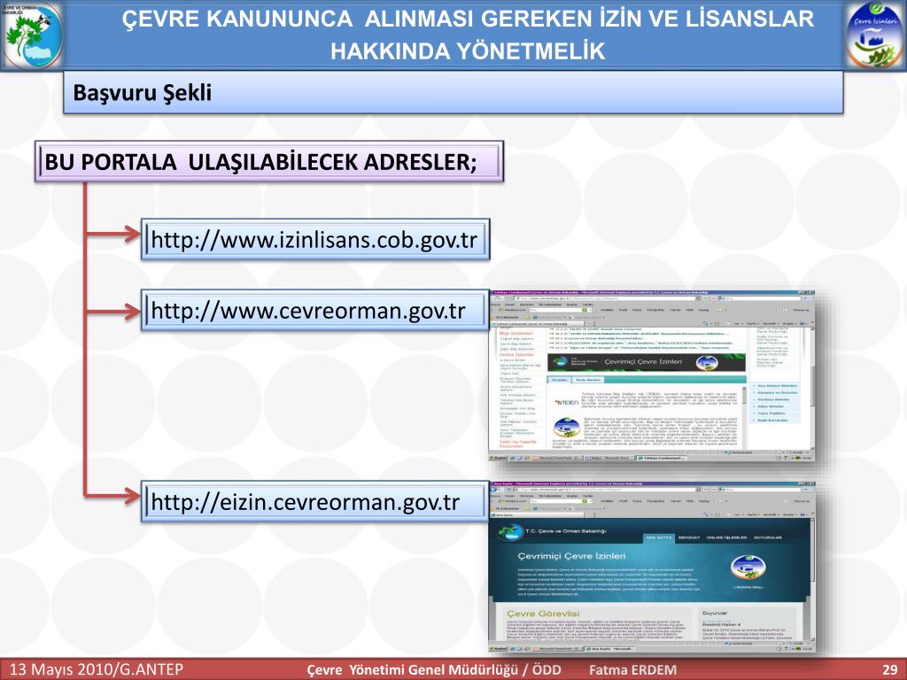 ÇEVRE KANUNUNCA ALINMASI GEREKEN İZİN VE LİSANSLAR HAKKINDA YÖNETMELİK Başvuru Şekli BU PORTALA ULAŞILABİLECEK ADRESLER; http://www.izinlisans.cob.gov.tr http://www.cevreorman.gov.tr http://eizin.cevreorman.gov.tr Çevre Yönetimi Genel Müdürlüğü / ÖDD Fatma ERDEM