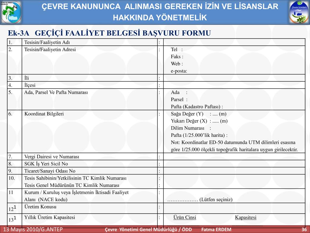 ÇEVRE KANUNUNCA ALINMASI GEREKEN İZİN VE LİSANSLAR HAKKINDA YÖNETMELİK Süreç Ek-3A GEÇİCİ FAALİYET BELGESİ BAŞVURU FORMU/ TESİSİN KİMLİĞİ • Tesisin / Faaliyetin Adı • Tesisin / faaliyetin Adresi • İli • İlçesi • Ada, Parsel, Pafta • Koordinat Bilgileri • Vergi Dairesi ve Numarası • SGK İşyeri Sicil No • Ticaret / sanayi Odası No • Tesis Yetkilisi TC Kimlik No • Nace Kodu • Üretim Konusu • Üretim Kapasitesi • Tesisin / Faaliyetin Alanı, Vardiya Sayısı, Kişi Sayısı • Tesisin / Faaliyetin Bulunduğu Bölge • ÇED Mevzuatına Göre Durumu Çevre Yönetimi Genel Müdürlüğü / ÖDD Fatma ERDEM