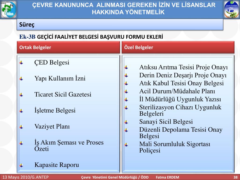 ÇEVRE KANUNUNCA ALINMASI GEREKEN İZİN VE LİSANSLAR HAKKINDA YÖNETMELİK Süreç Ek-3B GEÇİCİ FAALİYET BELGESİ BAŞVURU FORMU EKLERİ Ortak Belgeler Özel Belgeler • ÇED Belgesi • Yapı Kullanım İzni • Ticaret Sicil Gazetesi • İşletme Belgesi • Vaziyet Planı • İş Akım Şeması ve Proses Özeti • Kapasite Raporu • AtıksuArıtma Tesisi Proje Onayı • Derin Deniz Deşarjı Proje Onayı • Atık Kabul Tesisi Onay Belgesi • Acil Durum/Müdahale Planı • İl Müdürlüğü Uygunluk Yazısı • Sterilizasyon Cihazı Uygunluk Belgeleri • Sanayi Sicil Belgesi • Düzenli Depolama Tesisi Onay Belgesi • Mali Sorumluluk Sigortası Poliçesi Çevre Yönetimi Genel Müdürlüğü / ÖDD Fatma ERDEM