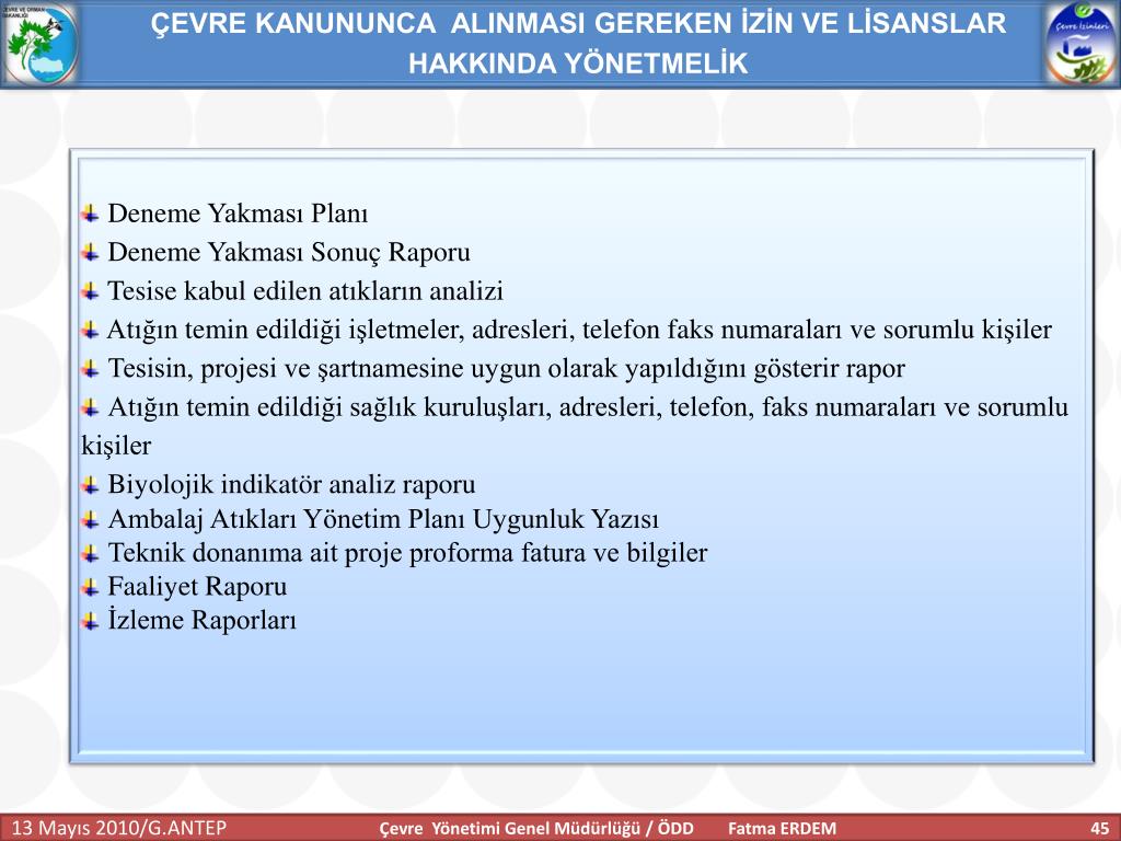 ÇEVRE KANUNUNCA ALINMASI GEREKEN İZİN VE LİSANSLAR HAKKINDA YÖNETMELİK • Deneme Yakması Planı • Deneme Yakması Sonuç Raporu • Tesise kabul edilen atıkların analizi • Atığın temin edildiği işletmeler, adresleri, telefon faks numaraları ve sorumlu kişiler • Tesisin, projesi ve şartnamesine uygun olarak yapıldığını gösterir rapor • Atığın temin edildiği sağlık kuruluşları, adresleri, telefon, faks numaraları ve sorumlu kişiler • Biyolojik indikatör analiz raporu • Ambalaj Atıkları Yönetim Planı Uygunluk Yazısı • Teknik donanıma ait proje proforma fatura ve bilgiler • Faaliyet Raporu • İzleme Raporları Çevre Yönetimi Genel Müdürlüğü / ÖDD Fatma ERDEM