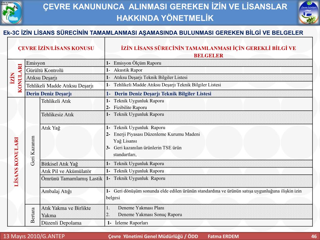 ÇEVRE KANUNUNCA ALINMASI GEREKEN İZİN VE LİSANSLAR HAKKINDA YÖNETMELİK Süreç Ek-3C SÜRECİNİN TAMAMLANMASI AŞAMASINDA BULUNMASI GEREKEN BİLGİ VE BELGELER • Emisyon Ölçüm Raporu • Akustik Rapor • Atıksu Deşarjı Teknik Bilgiler Listesi • Tehlikeli Madde Atıksu Deşarjı Teknik Bilgiler Listesi • Derin Deniz Deşarjı Teknik Bilgiler Listesi • Teknik Uygunluk Raporu • Fizibilite Raporu • Enerji Piyasası Düzenleme Kurumu MadeniYağ Lisansı • Geri kazanılan ürünlerin TSE ürün standartları, • Çevre Yönetim Sistem Belgesi • Geri dönüşüm sonunda elde edilen ürünün standardına ve ürünün satışa uygunluğuna ilişkin izin belgesi Çevre Yönetimi Genel Müdürlüğü / ÖDD Fatma ERDEM