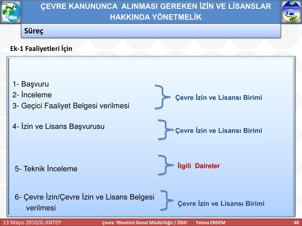 ÇEVRE KANUNUNCA ALINMASI GEREKEN İZİN VE LİSANSLAR HAKKINDA YÖNETMELİK Süreç Ek-1 Faaliyetleri İçin 1- Başvuru 2- İnceleme 3- Geçici Faaliyet Belgesi verilmesi Çevre İzin ve Lisansı Birimi 4- İzin ve Lisans Başvurusu Çevre İzin ve Lisansı Birimi İlgili Daireler 5- Teknik İnceleme 6- Çevre İzin/Çevre İzin ve Lisans Belgesi verilmesi Çevre İzin ve Lisansı Birimi Çevre Yönetimi Genel Müdürlüğü / ÖDD Fatma ERDEM