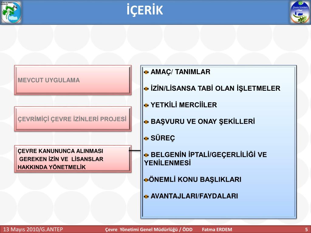 İÇERİK MEVCUT UYGULAMA AMAÇ/ TANIMLAR İZİN/LİSANSA TABİ OLAN İŞLETMELER YETKİLİ MERCİİLER BAŞVURU VE ONAY ŞEKİLLERİ SÜREÇ BELGENİN İPTALİ/GEÇERLİLİĞİ VE YENİLENMESİ ÖNEMLİ KONU BAŞLIKLARI AVANTAJLARI/FAYDALARI ÇEVRİMİÇİ ÇEVRE İZİNLERİ PROJESİ ÇEVRE KANUNUNCA ALINMASI GEREKEN İZİN VE LİSANSLAR HAKKINDA YÖNETMELİK Çevre Yönetimi Genel Müdürlüğü / ÖDD Fatma ERDEM