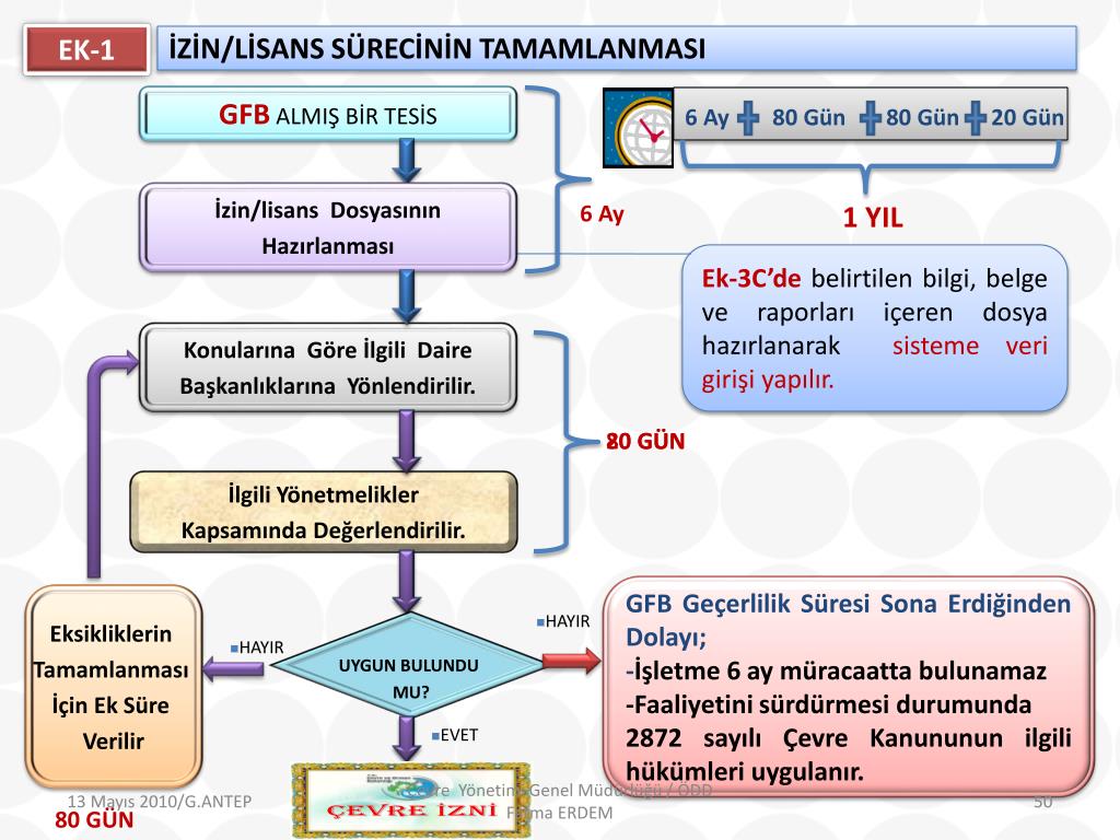EK-1 İZİN/LİSANS SÜRECİNİN TAMAMLANMASI GFB ALMIŞ BİR TESİS 6 Ay 80 Gün 80 Gün 20 Gün İzin/lisans Dosyasının Hazırlanması 6 Ay 1 YIL Ek-3C’de belirtilen bilgi, belge ve raporları içeren dosya hazırlanarak sisteme veri girişi yapılır. Konularına Göre İlgili Daire Başkanlıklarına Yönlendirilir. 20 GÜN 80 GÜN İlgili Yönetmelikler Kapsamında Değerlendirilir. GFB Geçerlilik Süresi Sona Erdiğinden Dolayı; -İşletme 6 ay müracaatta bulunamaz -Faaliyetini sürdürmesi durumunda 2872 sayılı Çevre Kanununun ilgili hükümleri uygulanır. Eksikliklerin Tamamlanması İçin Ek Süre Verilir • HAYIR UYGUN BULUNDU MU? • HAYIR • EVET Çevre Yönetimi Genel Müdürlüğü / ÖDD Fatma ERDEM 80 GÜN