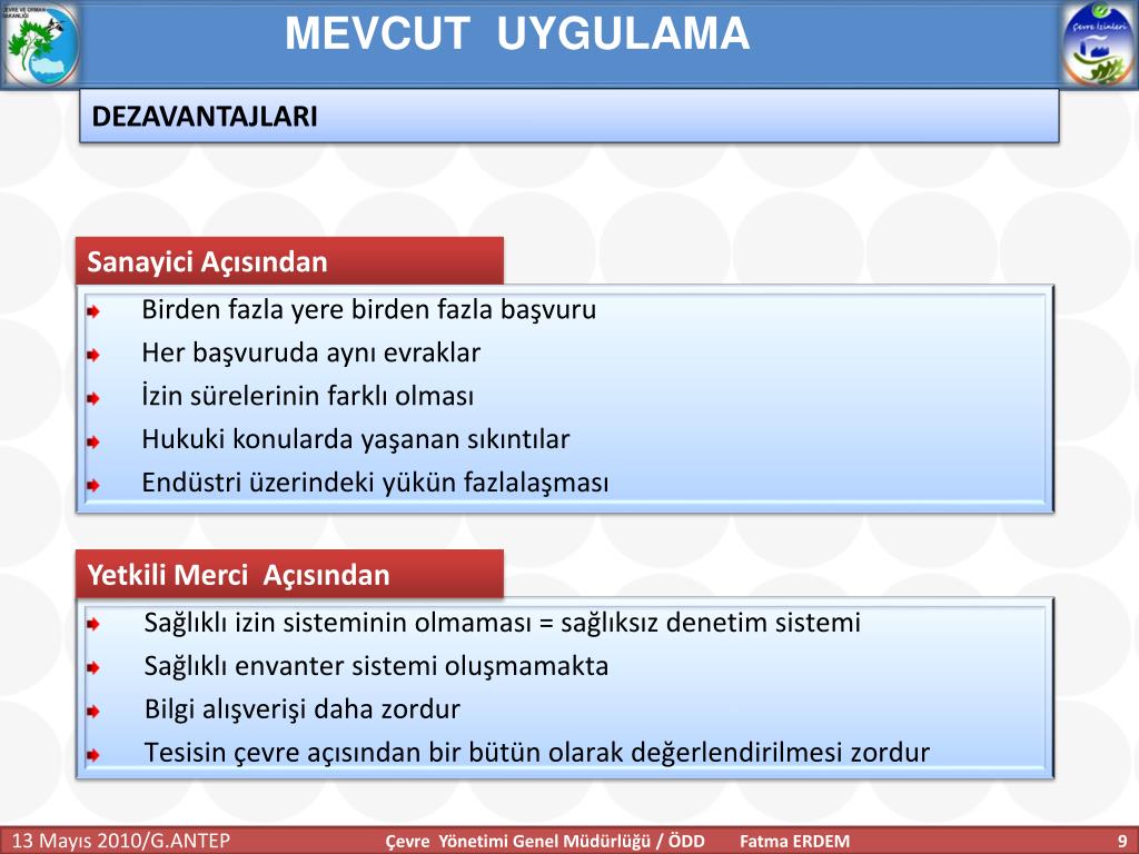 MEVCUT UYGULAMA DEZAVANTAJLARI Sanayici Açısından Birden fazla yere birden fazla başvuru Her başvuruda aynı evraklar İzin sürelerinin farklı olması Hukuki konularda yaşanan sıkıntılar Endüstri üzerindeki yükün fazlalaşması Yetkili Merci Açısından Sağlıklı izin sisteminin olmaması = sağlıksız denetim sistemi Sağlıklı envanter sistemi oluşmamakta Bilgi alışverişi daha zordur Tesisin çevre açısından bir bütün olarak değerlendirilmesi zordur Çevre Yönetimi Genel Müdürlüğü / ÖDD Fatma ERDEM