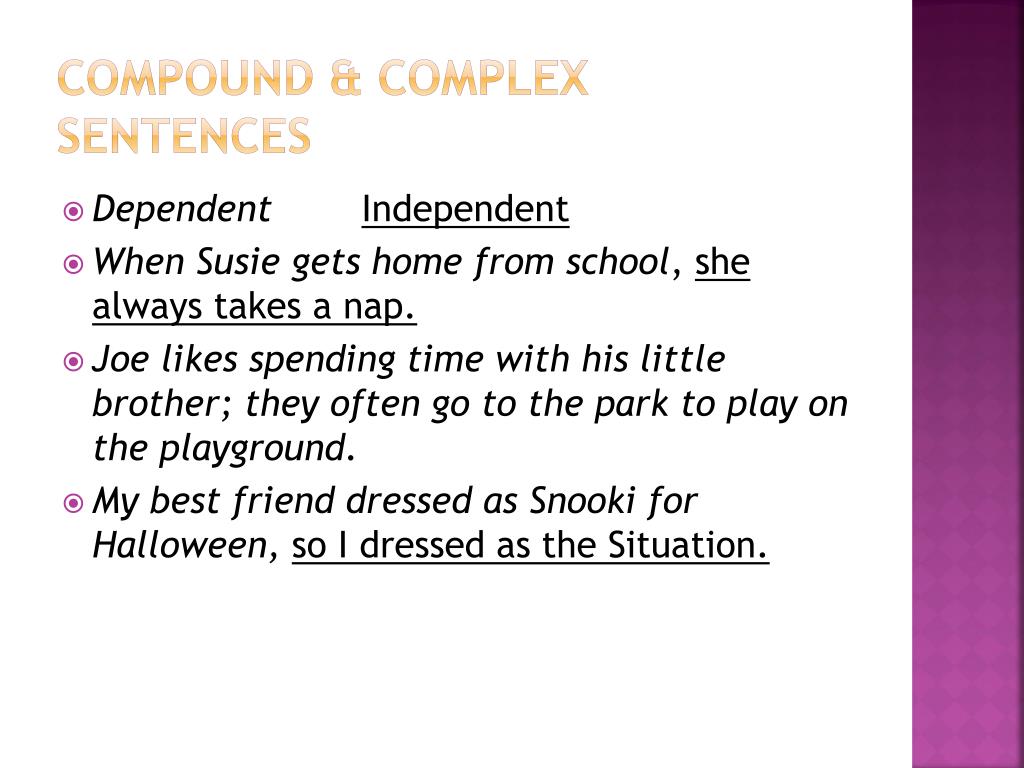 Compound & Complex Sentences • Dependent Independent • When Susie gets home from school, she always takes a nap. • Joe likes spending time with his little brother; they often go to the park to play on the playground. • My best friend dressed as Snooki for Halloween, so I dressed as the Situation.