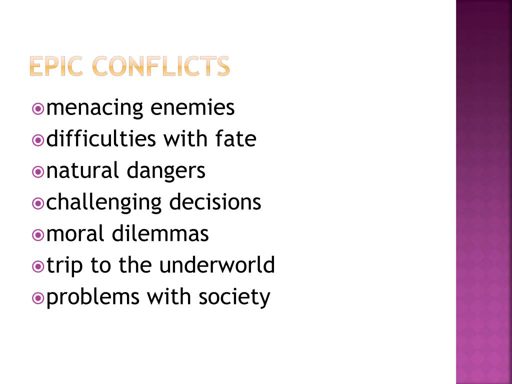 EPIC CONFLICTS • menacing enemies • difficulties with fate • natural dangers • challenging decisions • moral dilemmas • trip to the underworld • problems with society