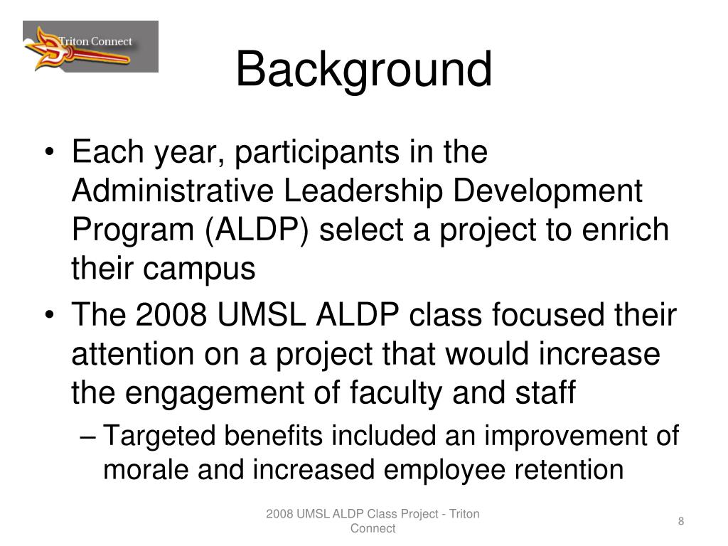 Background • Each year, participants in the Administrative Leadership Development Program (ALDP) select a project to enrich their campus • The 2008 UMSL ALDP class focused their attention on a project that would increase the engagement of faculty and staff • Targeted benefits included an improvement of morale and increased employee retention 2008 UMSL ALDP Class Project - Triton Connect 8