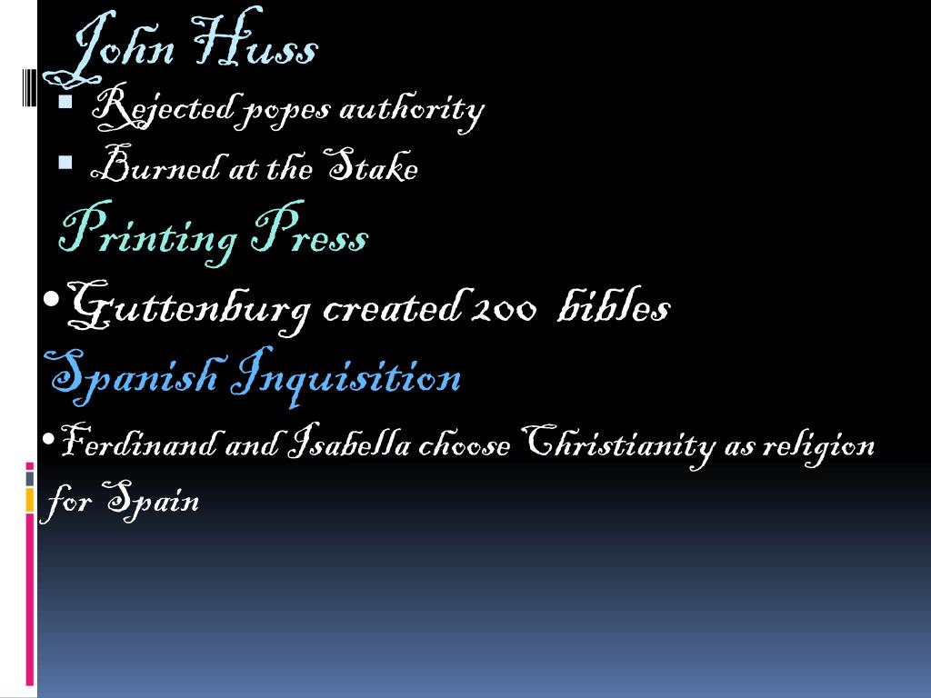 John Huss • Rejected popes authority • Burned at the Stake Printing Press • Guttenburg created 200 bibles Spanish Inquisition • Ferdinand and Isabella choose Christianity as religion • for Spain