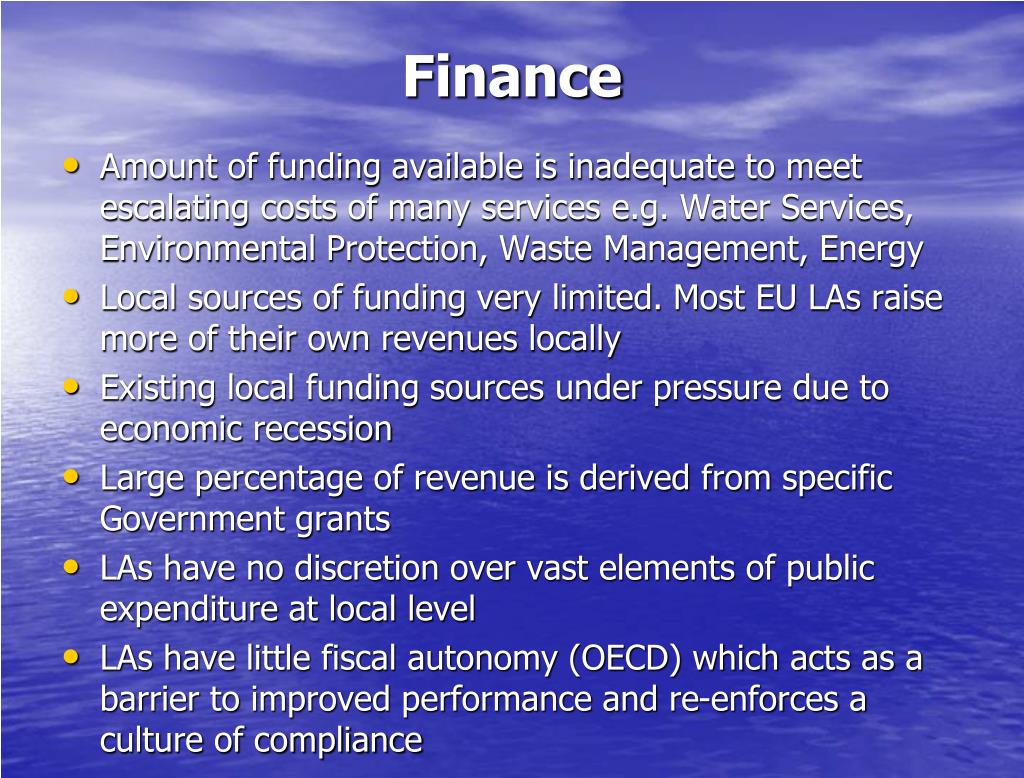Finance • Amount of funding available is inadequate to meet escalating costs of many services e.g. Water Services, Environmental Protection, Waste Management, Energy • Local sources of funding very limited. Most EU LAs raise more of their own revenues locally • Existing local funding sources under pressure due to economic recession • Large percentage of revenue is derived from specific Government grants • LAs have no discretion over vast elements of public expenditure at local level • LAs have little fiscal autonomy (OECD) which acts as a barrier to improved performance and re-enforces a culture of compliance