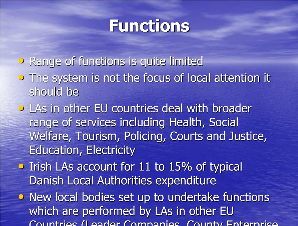 Functions • Range of functions is quite limited • The system is not the focus of local attention it should be • LAs in other EU countries deal with broader range of services including Health, Social Welfare, Tourism, Policing, Courts and Justice, Education, Electricity • Irish LAs account for 11 to 15% of typical Danish Local Authorities expenditure • New local bodies set up to undertake functions which are performed by LAs in other EU Countries (Leader Companies, County Enterprise Boards).