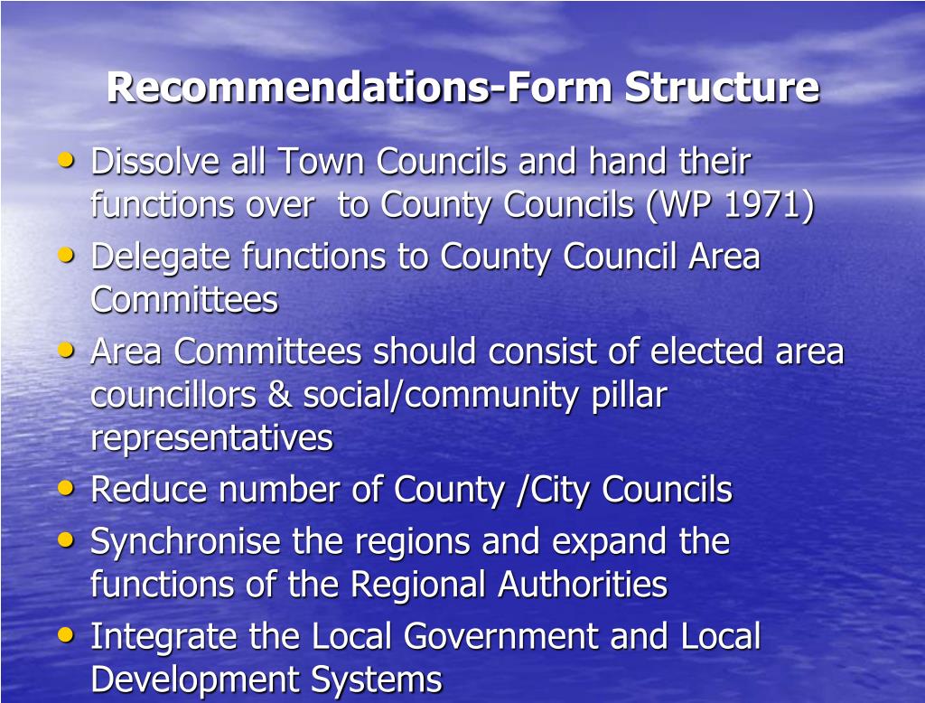 Recommendations-Form Structure • Dissolve all Town Councils and hand their functions over to County Councils (WP 1971) • Delegate functions to County Council Area Committees • Area Committees should consist of elected area councillors & social/community pillar representatives • Reduce number of County /City Councils • Synchronise the regions and expand the functions of the Regional Authorities • Integrate the Local Government and Local Development Systems
