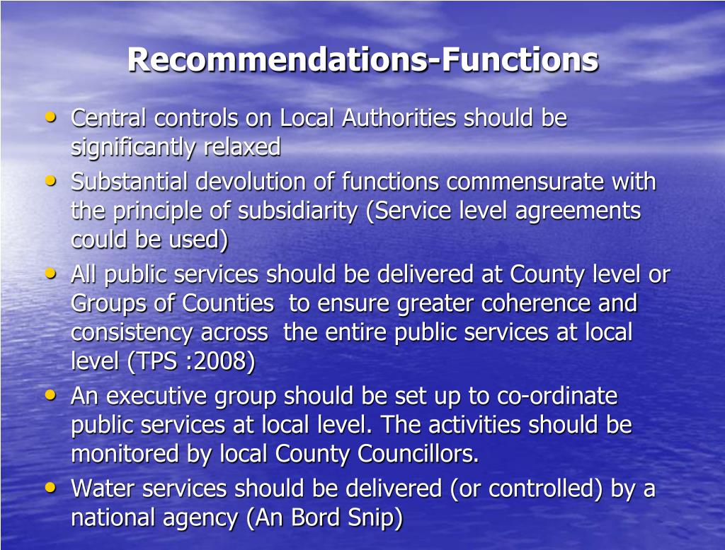 Recommendations-Functions • Central controls on Local Authorities should be significantly relaxed • Substantial devolution of functions commensurate with the principle of subsidiarity (Service level agreements could be used) • All public services should be delivered at County level or Groups of Counties to ensure greater coherence and consistency across the entire public services at local level (TPS :2008) • An executive group should be set up to co-ordinate public services at local level. The activities should be monitored by local County Councillors. • Water services should be delivered (or controlled) by a national agency (An Bord Snip)