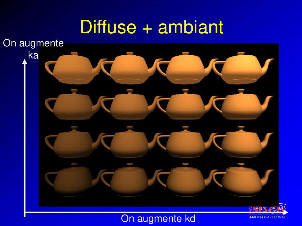 Réflexion ambiante • La couleur ne dépend pas de la position, uniquement de l’objet : I = Ia ka • Ia : lumière ambiante • ka: coefficient de réflexion ambiante • Modèle très primitif • Pas de sens physique possible • La forme des objets est invisible • Mais néanmoins très utile pour masquer les défauts des autres modèles