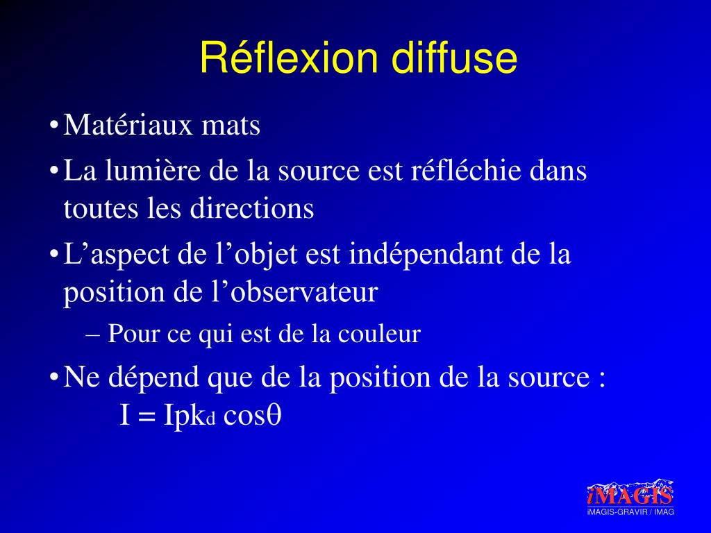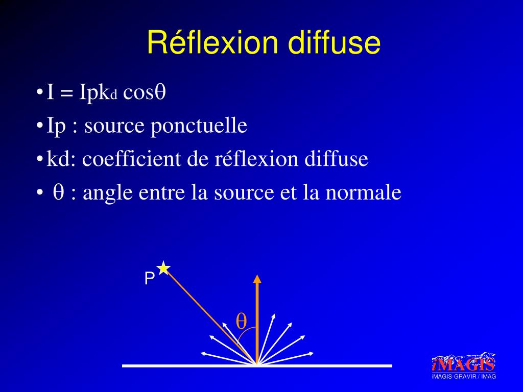 Réflexion diffuse • Matériaux mats • La lumière de la source est réfléchie dans toutes les directions • L’aspect de l’objet est indépendant de la position de l’observateur • Pour ce qui est de la couleur • Ne dépend que de la position de la source : I = Ipkd cosq