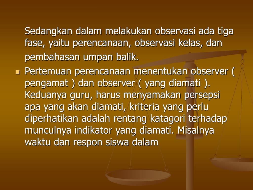 Sedangkan dalam melakukan observasi ada tiga fase, yaitu perencanaan, observasi kelas, dan pembahasan umpan balik. • Pertemuan perencanaan menentukan observer ( pengamat ) dan observer ( yang diamati ). Keduanya guru, harus menyamakan persepsi apa yang akan diamati, kriteria yang perlu diperhatikan adalah rentang katagori terhadap munculnya indikator yang diamati. Misalnya waktu dan respon siswa dalam