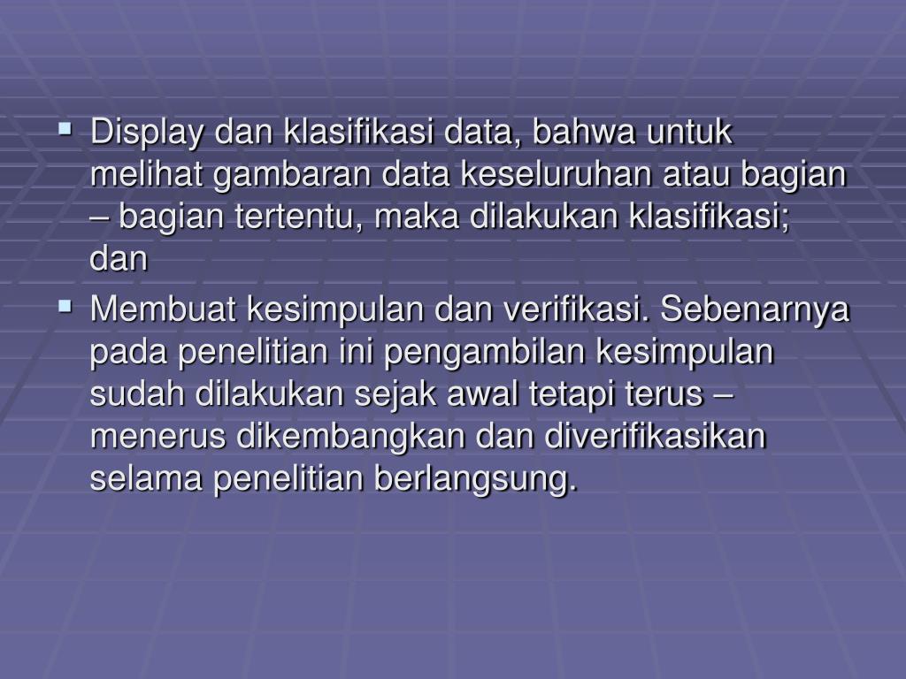 Display dan klasifikasi data, bahwa untuk melihat gambaran data keseluruhan atau bagian – bagian tertentu, maka dilakukan klasifikasi; dan • Membuat kesimpulan dan verifikasi. Sebenarnya pada penelitian ini pengambilan kesimpulan sudah dilakukan sejak awal tetapi terus – menerus dikembangkan dan diverifikasikan selama penelitian berlangsung.