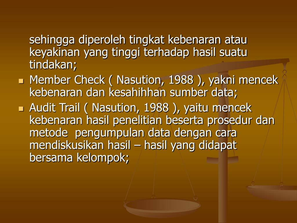 sehingga diperoleh tingkat kebenaran atau keyakinan yang tinggi terhadap hasil suatu tindakan; • Member Check ( Nasution, 1988 ), yakni mencek kebenaran dan kesahihhan sumber data; • Audit Trail ( Nasution, 1988 ), yaitu mencek kebenaran hasil penelitian beserta prosedur dan metode pengumpulan data dengan cara mendiskusikan hasil – hasil yang didapat bersama kelompok;