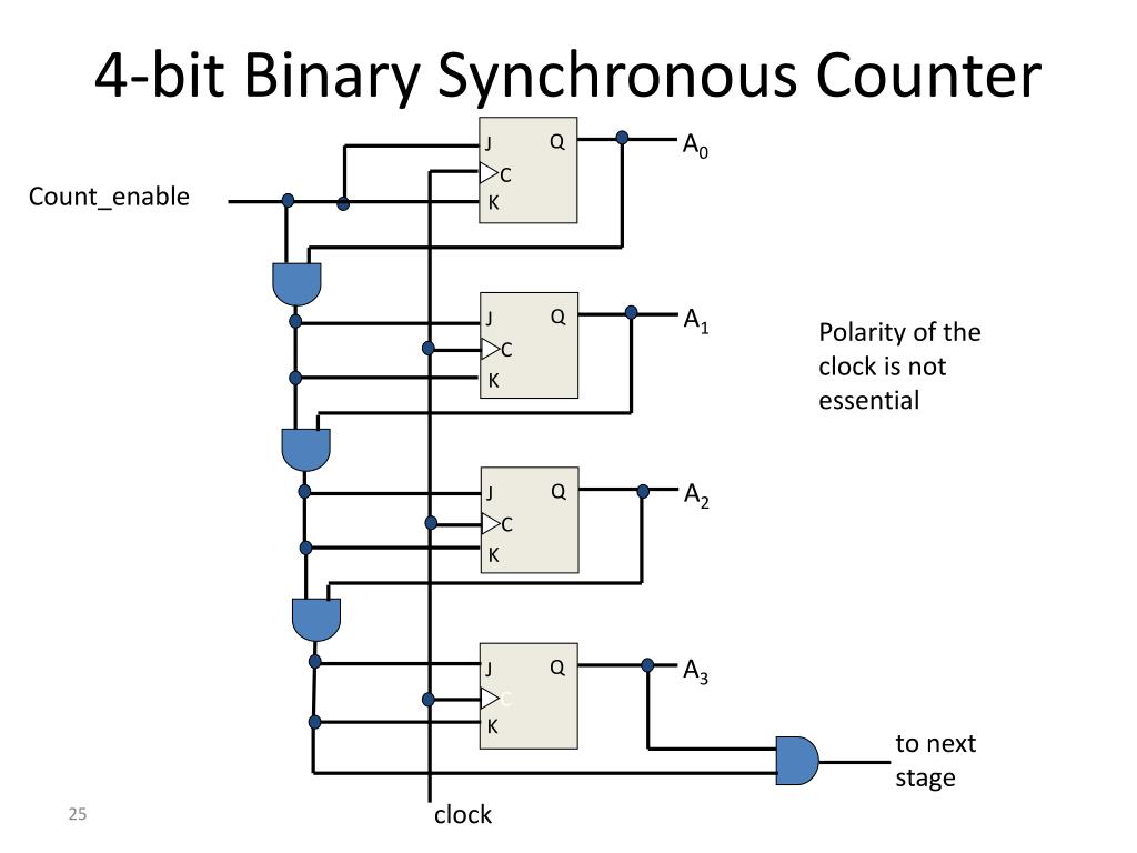 A0 Q J C Count_enable K A1 Q J C K A2 Q J C K A3 Q J C to next stage K clock 4-bit Binary Synchronous Counter Polarity of the clock is not essential
