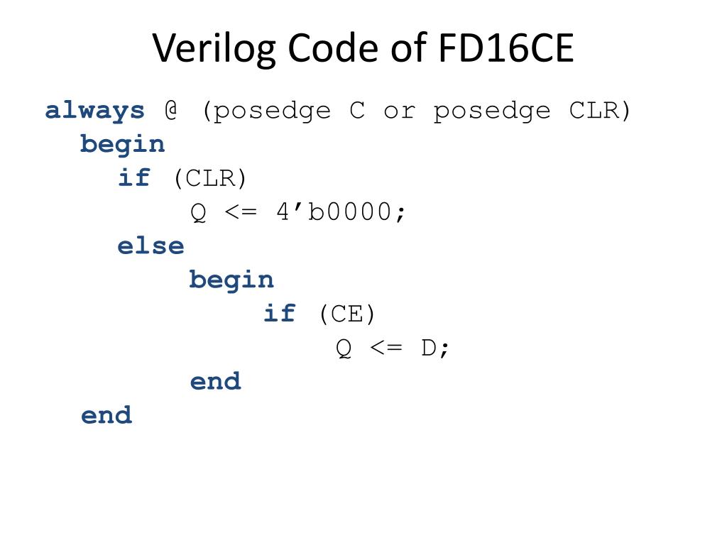 VerilogCode of FD16CE • always @ (posedge C or posedge CLR) • begin • if (CLR) • Q <= 4’b0000; • else • begin • if (CE) • Q <= D; • end • end