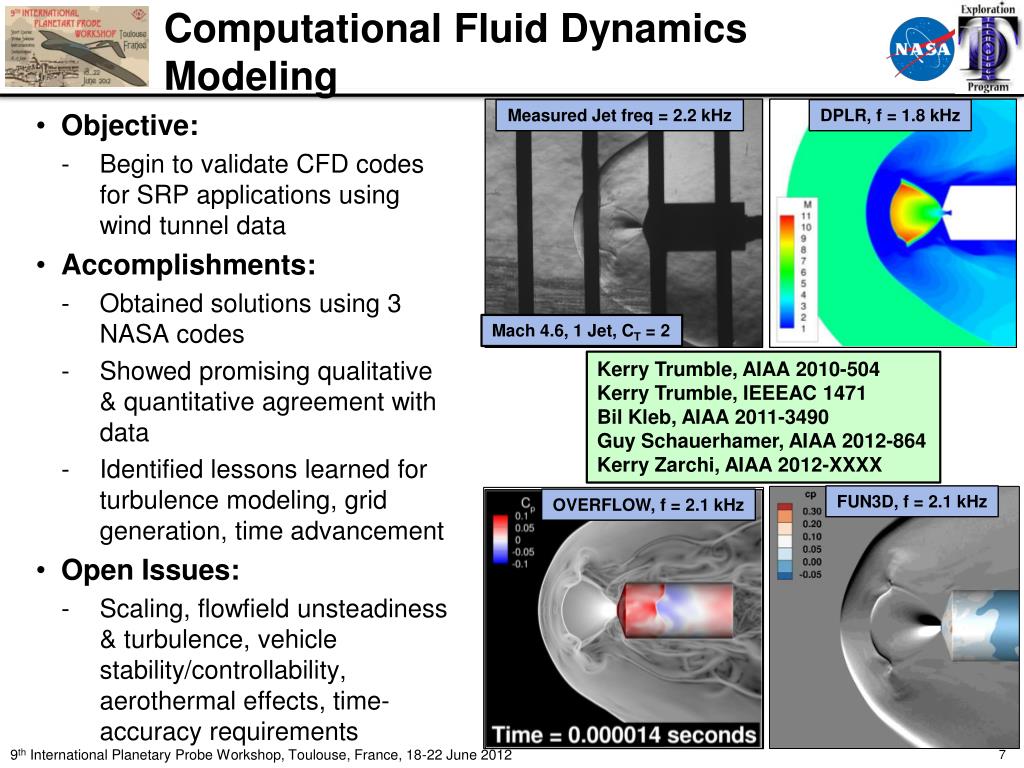 Computational Fluid Dynamics Modeling Measured Jet freq = 2.2 kHz DPLR, f = 1.8 kHz • Objective: • Begin to validate CFD codes for SRP applications using wind tunnel data • Accomplishments: • Obtained solutions using 3 NASA codes • Showed promising qualitative & quantitative agreement with data • Identified lessons learned for turbulence modeling, grid generation, time advancement • Open Issues: • Scaling, flowfield unsteadiness & turbulence, vehicle stability/controllability, aerothermal effects, time-accuracy requirements Mach 4.6, 1 Jet, CT = 2 Kerry Trumble, AIAA 2010-504 Kerry Trumble, IEEEAC 1471 BilKleb, AIAA 2011-3490 Guy Schauerhamer, AIAA 2012-864 Kerry Zarchi, AIAA 2012-XXXX FUN3D, f = 2.1 kHz OVERFLOW, f = 2.1 kHz