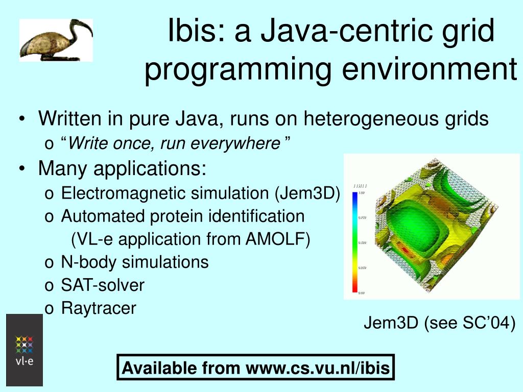 Ibis: a Java-centric grid programming environment • Written in pure Java, runs on heterogeneous grids • “Write once, run everywhere ” • Many applications: • Electromagnetic simulation (Jem3D) • Automated protein identification (VL-e application from AMOLF) • N-body simulations • SAT-solver • Raytracer Jem3D (see SC’04) Available from www.cs.vu.nl/ibis