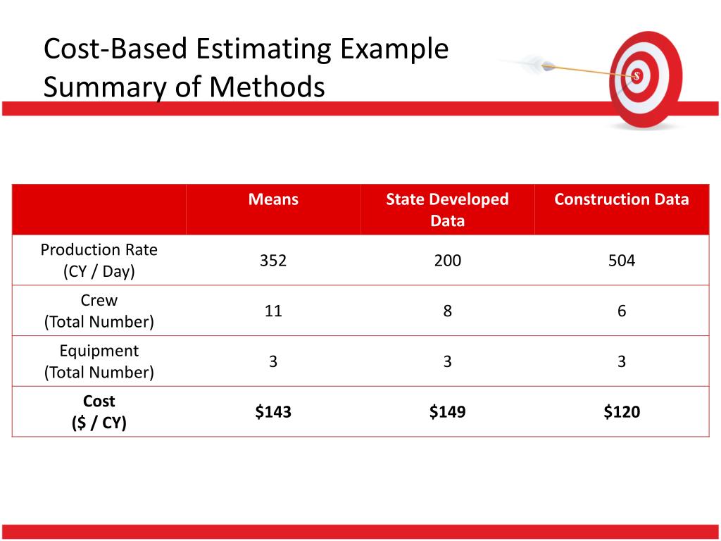 Cost-Based Estimating ExampleUsing State Developed Estimating Data • Two-Lane Asphalt Resurfacing • Minor Urban Arterial • 13,797 Vehicles / Day • Production Rate • 200 CY / 8 Hour Day • Crew • 1 Foreman • 4 Laborers • 3 Equipment Operators • Equipment • 1 Paver • 1 Steel Roller • 1 Pneumatic Roller • Total Estimated Cost = $149 / CY
