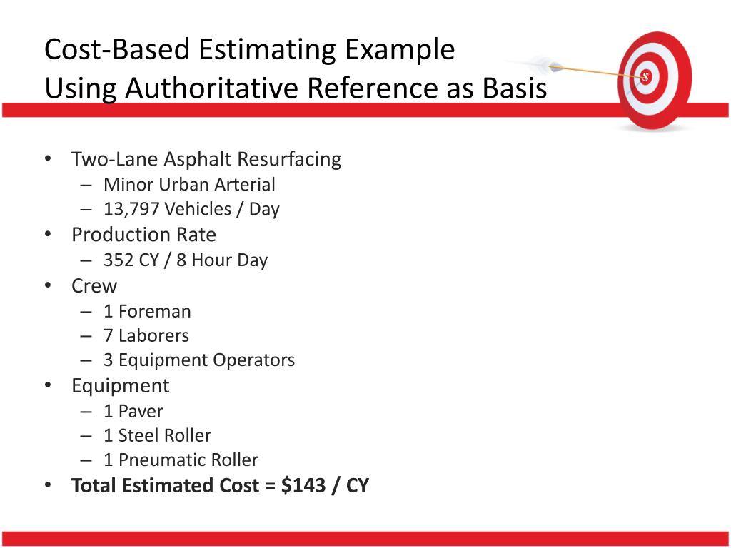 Cost-Based Estimating ExampleUsing Authoritative Reference as Basis • Two-Lane Asphalt Resurfacing • Minor Urban Arterial • 13,797 Vehicles / Day • Production Rate • 352 CY / 8 Hour Day • Crew • 1 Foreman • 7 Laborers • 3 Equipment Operators • Equipment • 1 Paver • 1 Steel Roller • 1 Pneumatic Roller • Total Estimated Cost = $143 / CY
