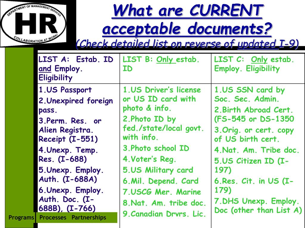 What are CURRENT acceptable documents?(Check detailed list on reverse of updated I-9) Programs Processes Partnerships
