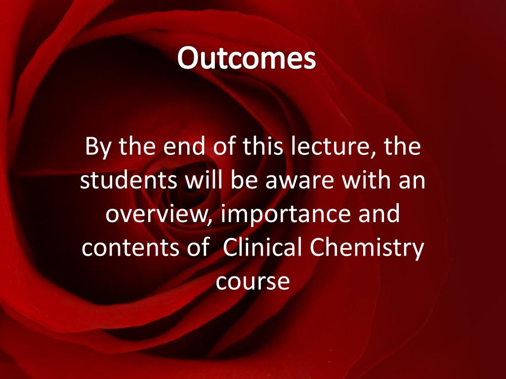 Outcomes By the end of this lecture, the students will be aware with an overview, importance and contents of Clinical Chemistry course