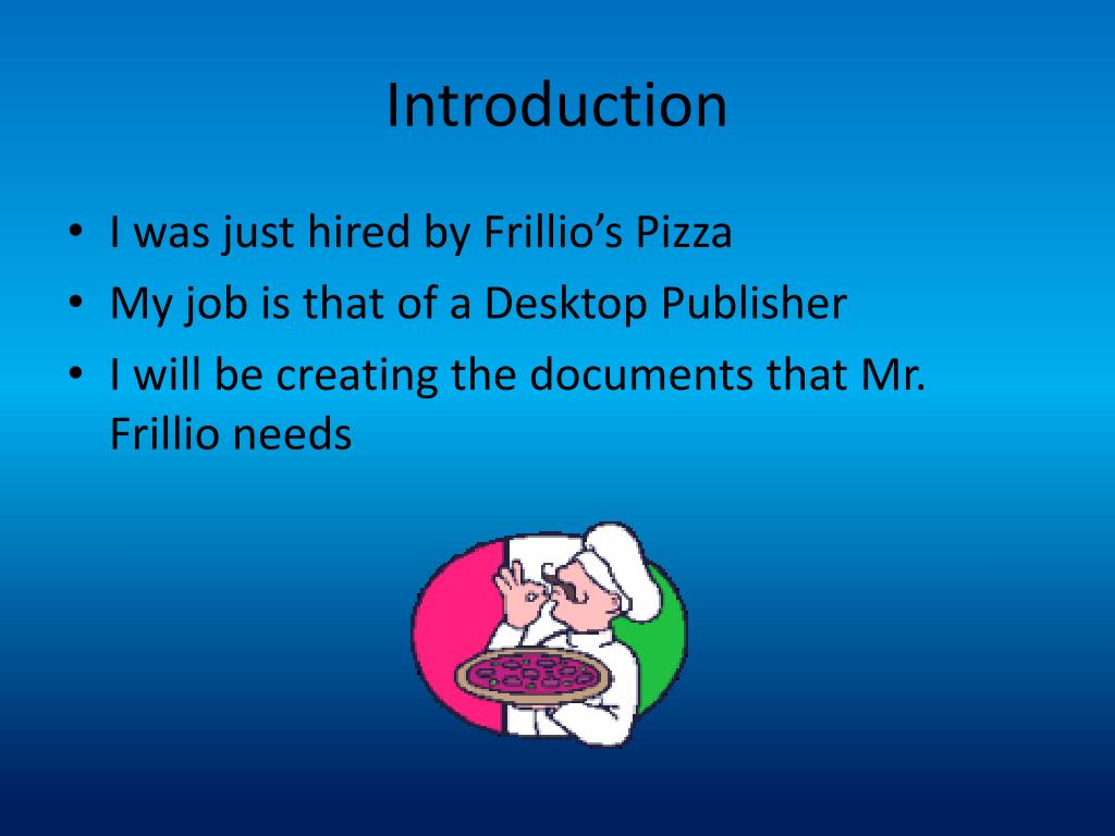 Introduction • I was just hired by Frillio’s Pizza • My job is that of a Desktop Publisher • I will be creating the documents that Mr. Frillio needs