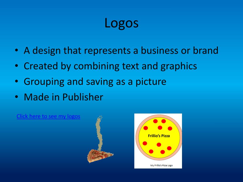 Logos • A design that represents a business or brand • Created by combining text and graphics • Grouping and saving as a picture • Made in Publisher Click here to see my logos