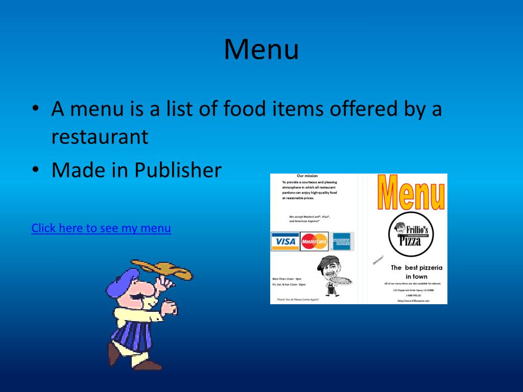 Menu • A menu is a list of food items offered by a restaurant • Made in Publisher Click here to see my menu