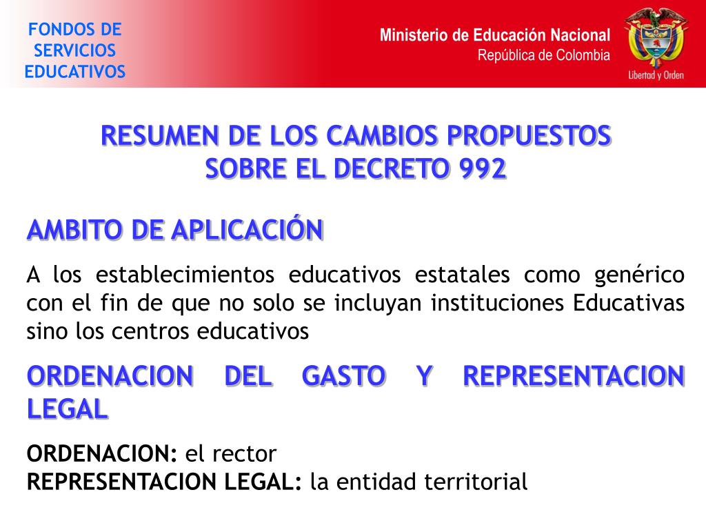 FONDOS DE SERVICIOS EDUCATIVOS Ministerio de Educación Nacional República de Colombia RESUMEN DE LOS CAMBIOS PROPUESTOS SOBRE EL DECRETO 992 AMBITO DE APLICACIÓN A los establecimientos educativos estatales como genérico con el fin de que no solo se incluyan instituciones Educativas sino los centros educativos ORDENACION DEL GASTO Y REPRESENTACION LEGAL ORDENACION: el rector REPRESENTACION LEGAL: la entidad territorial